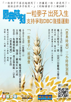 【時代論壇訊】《恩典時刻》於10月17日(週三)晚上8時至11時作三小時特別版直播節目,於DBC1台及2台聯播,主持:羅民威、車頤、陳守賢聯同一眾嘉賓主持。