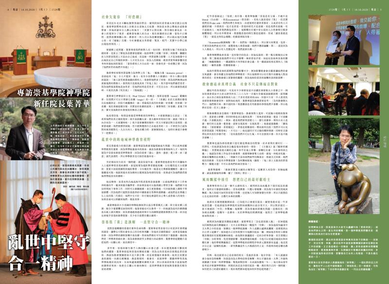 亂世中堅守合一精神專訪崇基學院神學院新任院長葉菁華 2020年10月16日 去年開始的反修例運動,加上今年全球橫行的新冠疫情,令香港人都忙於應對亂世,疲於奔命。但在此時,人稱「青蛙老師」、原為香港中文大學崇基學院神學院(下稱崇基)副教授的葉菁華,卻迎難而上,背負多一份責任,在...... 本文只供訂戶閱讀, 請先訂閱或 登入。守護自由空間,請付費訂閱《時代論壇》。