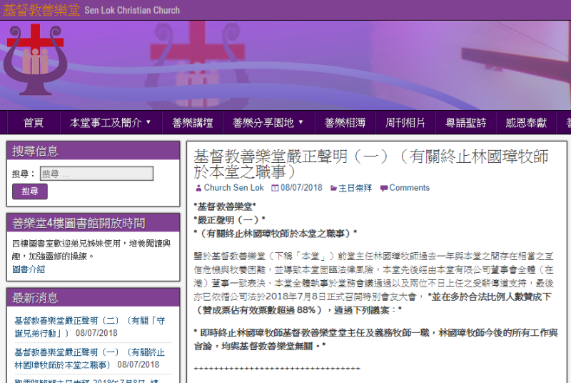 【時代論壇訊】基督教善樂堂有限公司董事會暨基督教善樂堂堂議會於七月八日在該堂網站及面書專頁上發出嚴正聲明,指該堂前堂主任林國璋牧師因涉及利益衝突的操守問題而即時終止他於該堂之職事;另該堂亦由即時起終止「守護兄弟行動」事工及相關財務管理的支援。林國璋於同日發表文章,指議決終止其職務的特別會友大會只給他十分鐘的發言時間,是對他是不公平及不恰當,惟文章未有回應利益衝突一事。
