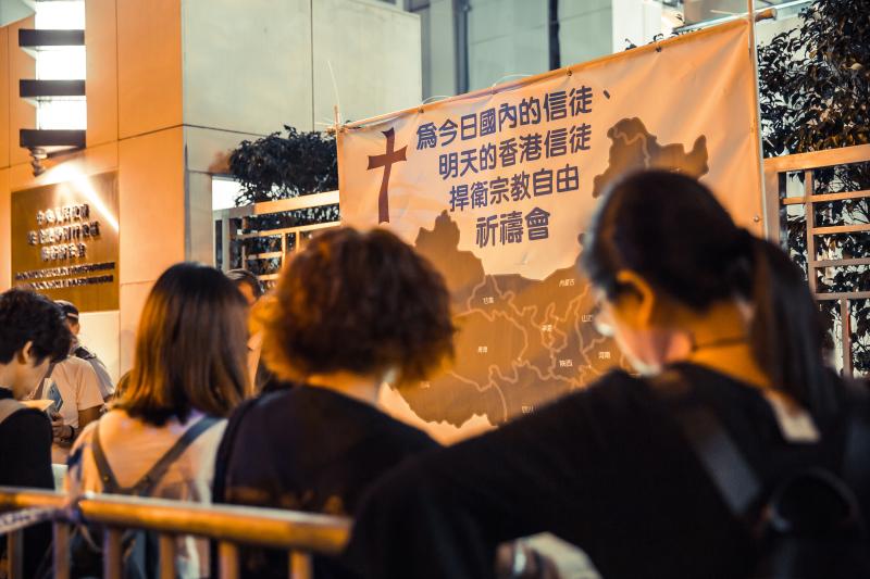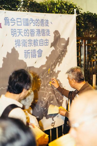 於禱告部份,眾人以啟應及個人禱告方式,為中國教會受壓迫、未成年人士的宗教自由、被捕的宗教人士及中港兩地宗教自由祈禱。他們期望,內地的基督徒於壓迫中,能繼續持守信仰,同時本港信徒能堅守「行公義、好憐憫」的心,為公義、真理發聲。隨後,會眾把大會為每人準備的十字架貼紙,貼在一幅大型的中國地圖上,寓意為內地多省的狀況禱告,並送上祝福。