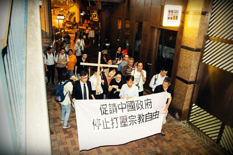 聚會完結前,會眾拉起寫有「促請中國政府停止打壓宗教自由」的橫額,並由劉志雄舉起木製十字架,連同馮智活牧師帶領會眾繞行中聯辦一圈。途中,他們手持燭光,並且唱頌We shall Overcome。